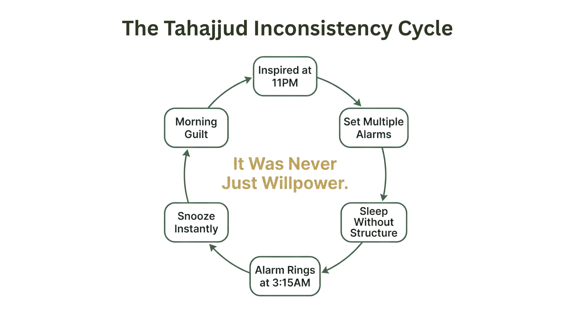 It takes you from wanting to pray Tahajjud to actually doing it consistently, and removes friction at every point where previous attempts have failed.